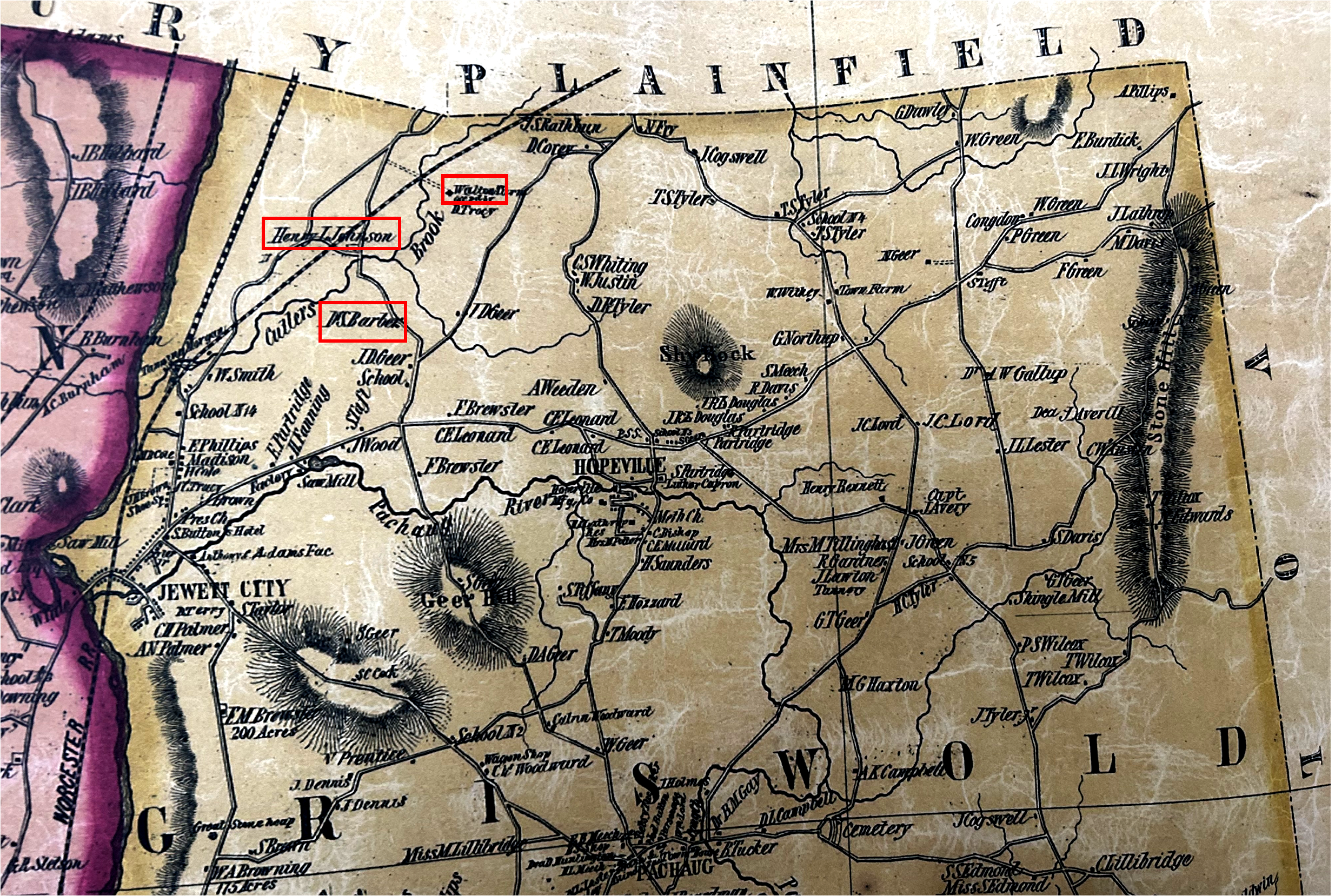 "September Ye 18, 1758*. *The Hale Cemetery Collection provides the same transcription of Jemima's headstone, but lists her year of death as 1754. Considering that Nathaniel married a second time on 19 June 1755 , the 1754 date is probably the accurate one. Dorothea Ihloff appears in the 1920 and 1930 US Censuses for Griswold, Connecticut. In the 1930 census, her residence is listed as a farm on “The Old Road to Plainfield”. A home that clearly matches the illustration of the Deacon H. L. Johnson dwelling house in The History of Norwich is located on Lily Pond Road just north of the intersection with Haley Meadow Road. The Walton farmland and cemetery would be approximately ¼ mile northeast of this location.