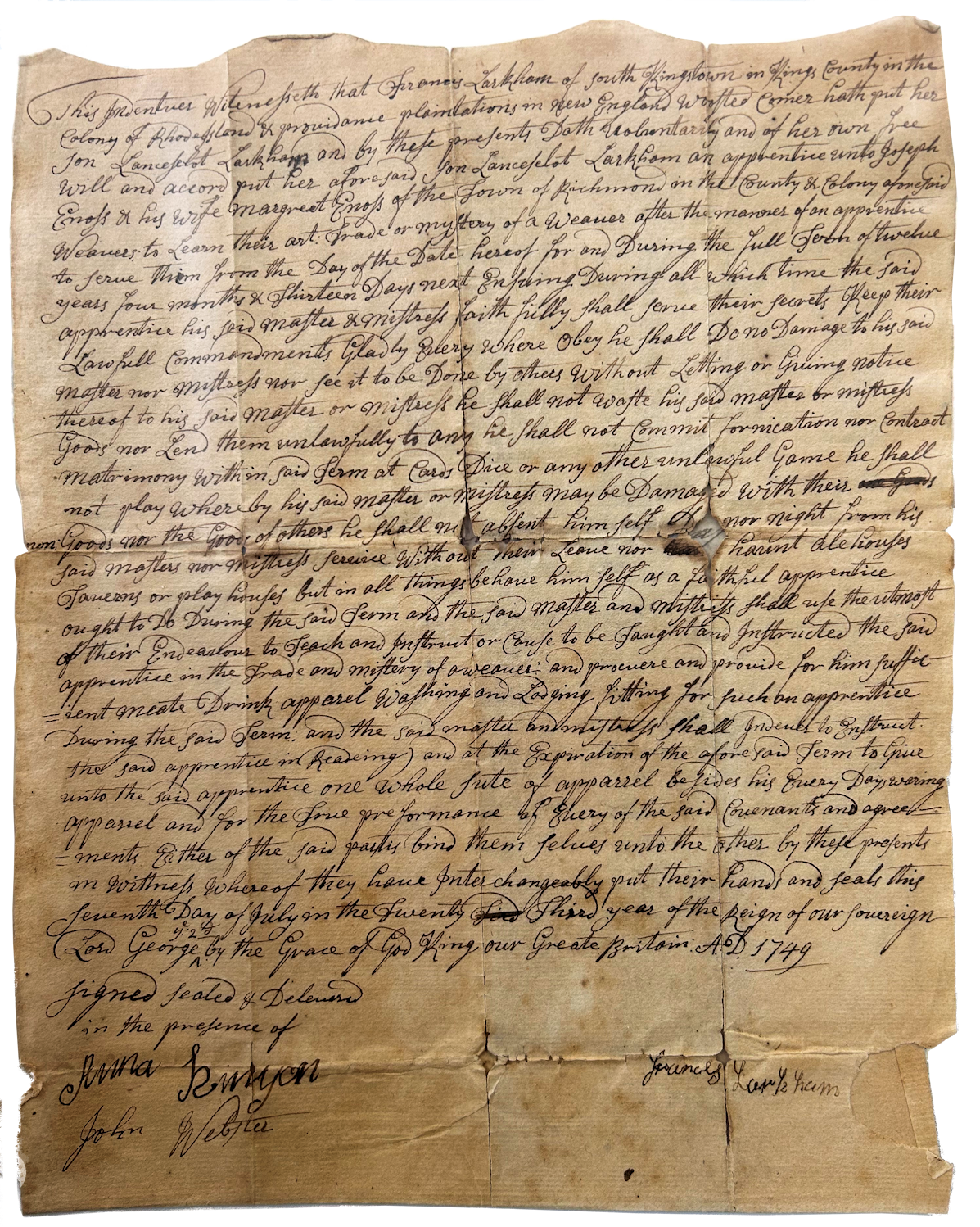 This indenture witnesseth that Frances Larkham of South Kingstown in Kings County in the Colony of Rhode Island & Providence Plantation in New England *Woosted Corner hath put her son Lanceselot Larkham and by these presents doth voluntarily and of her own free will and accord put her aforesaid son Lanceselot Larkham an apprentice unto Joseph Enoss & his wife Margaret Enoss of the town of Richmond in the county & colony aforesaid Weavers to learn their art: Trade or mystery of a weaver after the manner of an apprentice, to serve Them from the Day of the Date hereof for and During the full term of twelve years, four months & Thirteen Days next Ensuring during all which time the said apprentice his said Master and Mistress faith fully shall serve their secrets keep their Lawful Commandments Gladly Every where obey. He shall Do no Damage to his said Master nor Mistress nor see it to be Done by others without Letting or Giving notice thereof to his said Master or Mistress. He shall not waste his said Master or Mistress Goods nor Lend them unlawfully to any. He shall not Commit fornication nor Contract Matrimony within said Term. At Cards, Dice or any other unlawful Game he shall not play, whereby his said Master or Mistress may be Damaged with their own Goods nor the Goods of others. He shall not absent himself Day nor night from his said Master nor Mistress service Without their leave nor haunt alehouses taverns or play houses but in all things behave himself as a faithful apprentice ought to do. During the said Term and the Said Master and Mistress shall use the utmost of their Endeavors to Teach and Instruct or Cause to be Taught and Instructed the said apprentice in the Trade and mastery of a weaver and procure and provide for him sufficient meate Drink apparel washing and lodging fitting for such an apprentice. During the said Term and the said master and mistress shall endeavor to Enstruct the said apprentice in Reading and at the Expiration of the aforesaid Term to Give unto the said apprentice one whole sute of apparrel besides his Every Day wearing apparrel and for the True performance of Every of the Said covenants and agreements Either of the Said parties bind themselves unto the other by these presents in witness whereof they have Interchangeably put their hands and seals this seventh Day of July in the Twenty Third year of the reign of our sovereign Lord George by the Grace of God King our Greate Britain: A.D. 1749 Signed sealed & Delivered