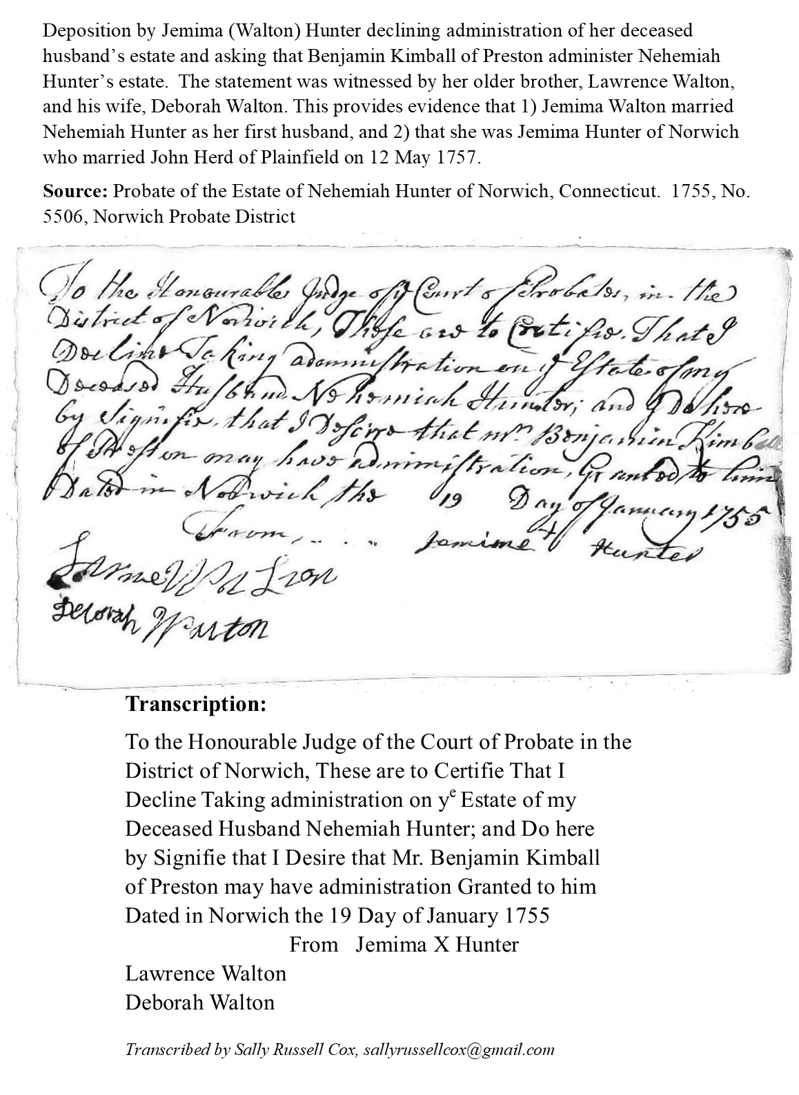 Nathaniel Walton, the second oldest son of Lawrence and Margaret (Smith) Walton, was born 20 March 1697 in Preston, Connecticut. He married Jemima (__) about 1716, and from all accounts settled on the land his father deeded to him in 1725 for his entire life. He and Jemima had six known children, born between 1717 and 1750 (Canterbury Vital Records, 1696-1820; Norwich Vital Records, 1640-1834; Connecticut Probate Records, 1609-1999):