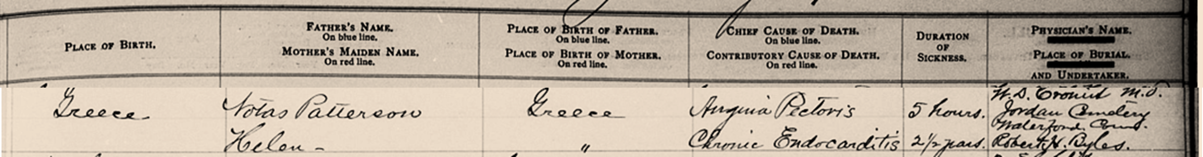 John Patterson, age 56 (although some records indicate he was probably 53), son of Notas and Helen Patterson (the same parents given listed for Socrates' younger sister Sotera, in her death certificate), candymaker, died at 129 Main Street on 17 January 1910 of angina pectoris (chest pain or discomfort due to coronary heart disease). He had been ill with chronic endocarditis for 2 ½ years. His doctor was W.D. Cronin (William D. Cronin, the same doctor that delivered all of Socrates and Helene Patterson’s children). He was buried at Jordan Cemetery in Waterford, Connecticut. A search of the memorials at Jordan Cemetery brought up nothing for John Patterson, but interestingly enough, there is a memorial for John Graco, who died 17 January 1910, and on his headstone is carved, “U.S.S. Brooklyn, U.S. Navy, Spanish-American War”. The date of death and military service is identical to information provided in news articles for John Patterson. It has to be the same man. |