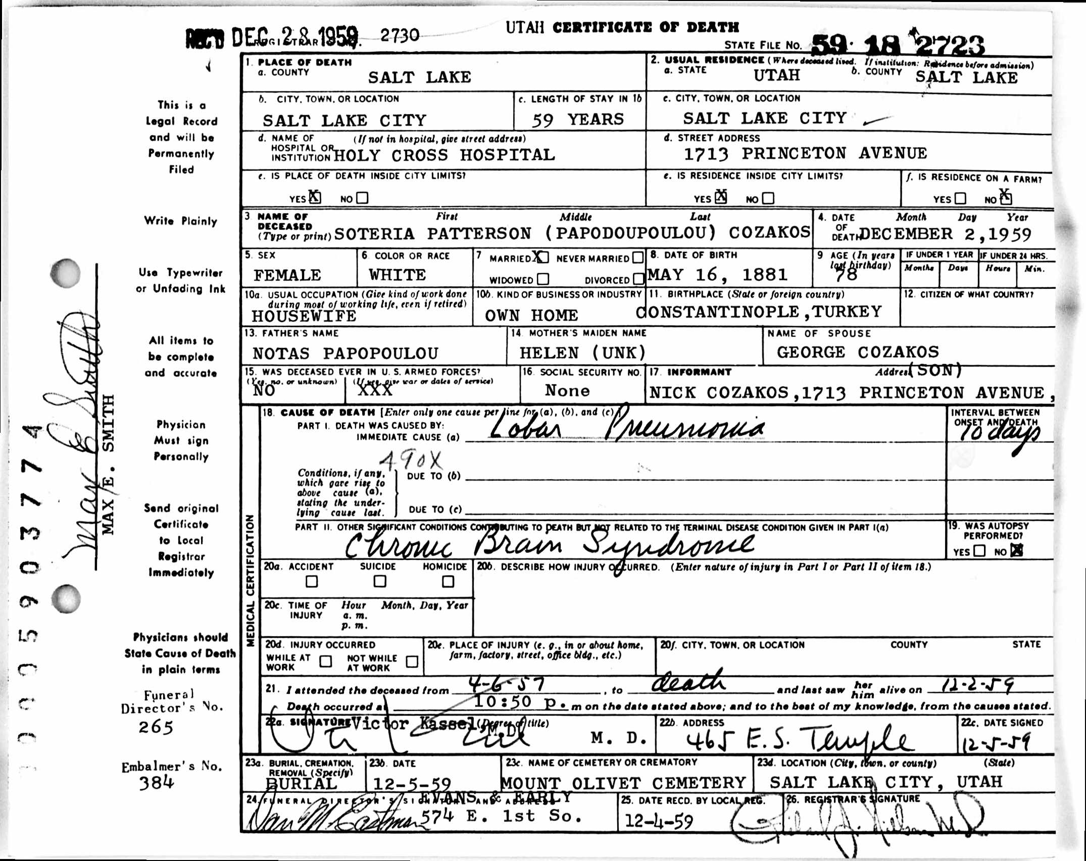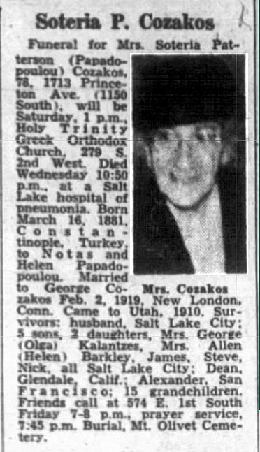 Although the living family knows little else of Socrates' activities abroad in 1920, it is clear that his health progressively deteriorated. On 19 March 1920, the American Consulate issued a Report of the Death of an American Citizen [68], stating that Socrates Patterson, a naturalized citizen, had died 16 March 1920 at the Hospital Franchet d’Esperey in Constantinople of kidney disease. He had been accompanied on the trip by his nephew, S.F. Peterson (Stavros Peterson). Socrates was buried at the Şişli (Chichli ) Greek Orthodox Cemetery in Constantinople, and his effects were given to his father-in-law, George Kelezides [sic] of Passage Crespin, Pera, Constantinople. The report listed Socrates’ residence as Pacific Street, New London, Connecticut. He was 47 years old. Socrates was survived by Helene, now 34, and seven children between the ages of 16 and one. It is interesting that a note at the bottom of the page states, “Certificate of death issued by the Oecumenical Patriarchate March 3rd, 1920", so perhaps this was the actual date of his death, and the date of burial was March 16. Articles in The Day and the Norwich Bulletin reported on Socrates' death locally.[69; 70] A 24 May 1920 article in the Norwich Bulletin announced that Socrates' will was filed in probate court. His estate was valued at $100,638.48 (worth about $1,376,568.35 today), bequeathed entirely to his wife Helene.[71]